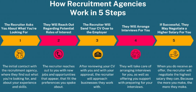 The above image shows how a recruitment agency works. This step by step process allows agencies to generate leads and build partnerships.