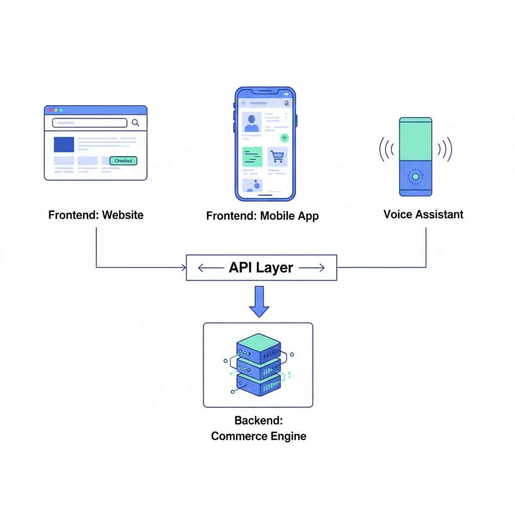 The backend commerce engine is channel-agnostic. If the customer opens your mobile app later, that app makes the same API call to the same backend and pulls the exact same cart data. If they use a voice assistant and ask to add an item, the voice interface sends a similar request and gets the same outcome. Even an in-store kiosk taps into the same product catalog and inventory pool.