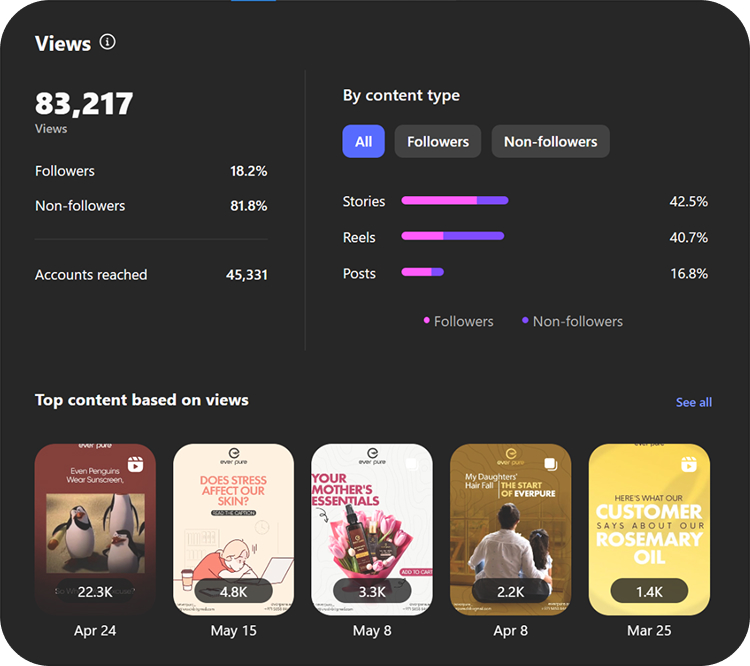In a market where paid campaigns often struggle to stand out, EverPure’s success proves that precision beats guesswork. With a modest ad spend of just AED 11/day and fewer than 1,000 followers, EverPure reached over 25,000+ viewers and drove 1,000+ meaningful engagements, well beyond typical performance benchmarks for small UAE-based brands.
